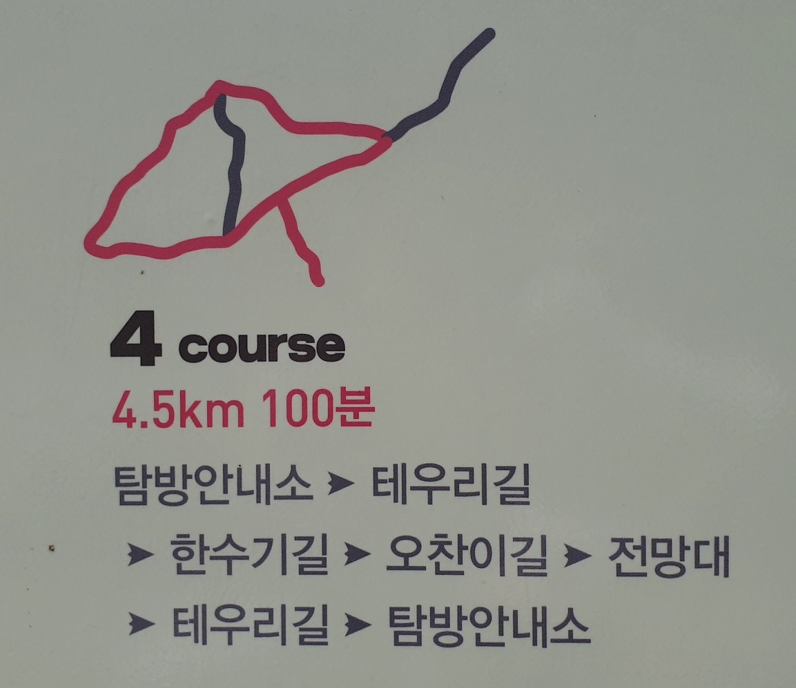 1. 코스 : 탐방 안내소 → 테우리길 → 한수기길 → 오찬이길 → 전망대 → 테우리길 → 탐방안내소