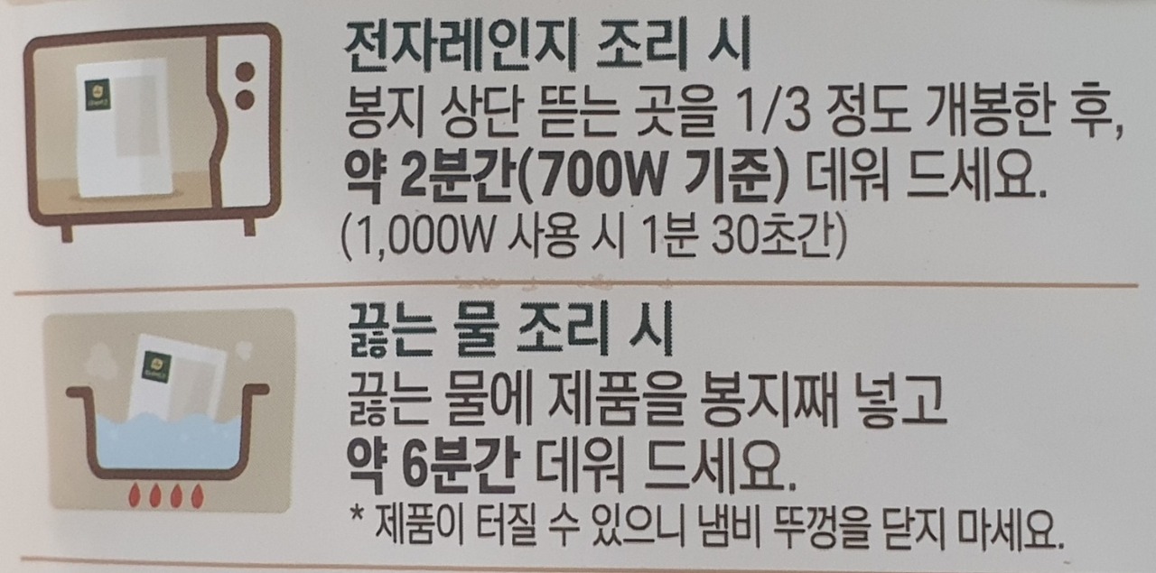 끓는 물에 제품을 봉지째 넣고 약 6분간 데워 드세요.