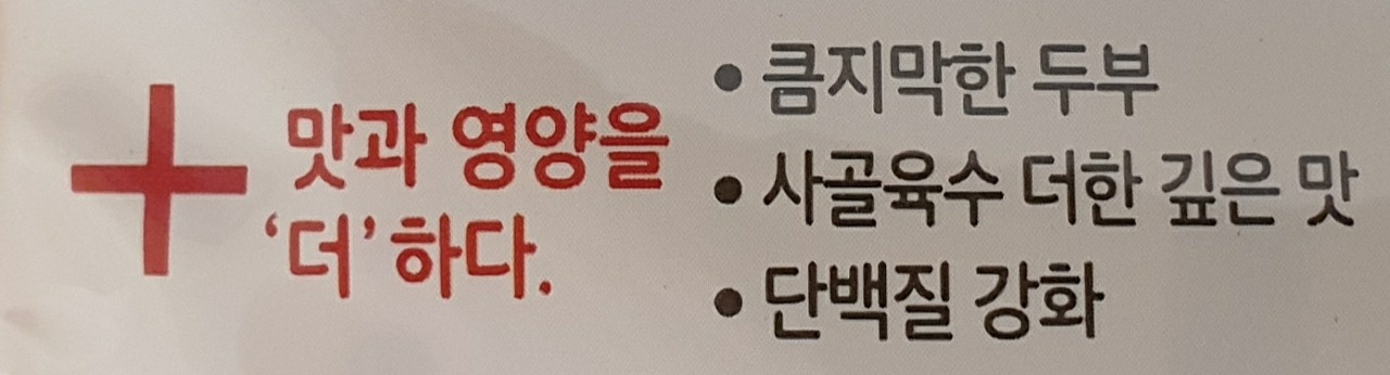두부 37%, 청국장 1.41%, 돼지고기 5.35%, 사골농축액 23-1.02%[사골추출물 88%{사골(고형분 52%)}]