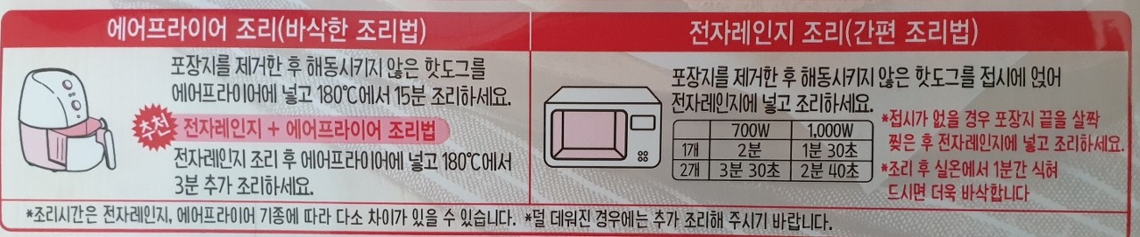 - 700W(1개 2분 / 2개 3분 30초), 1,000W(1개 1분 30초, 2개 2분 40초)