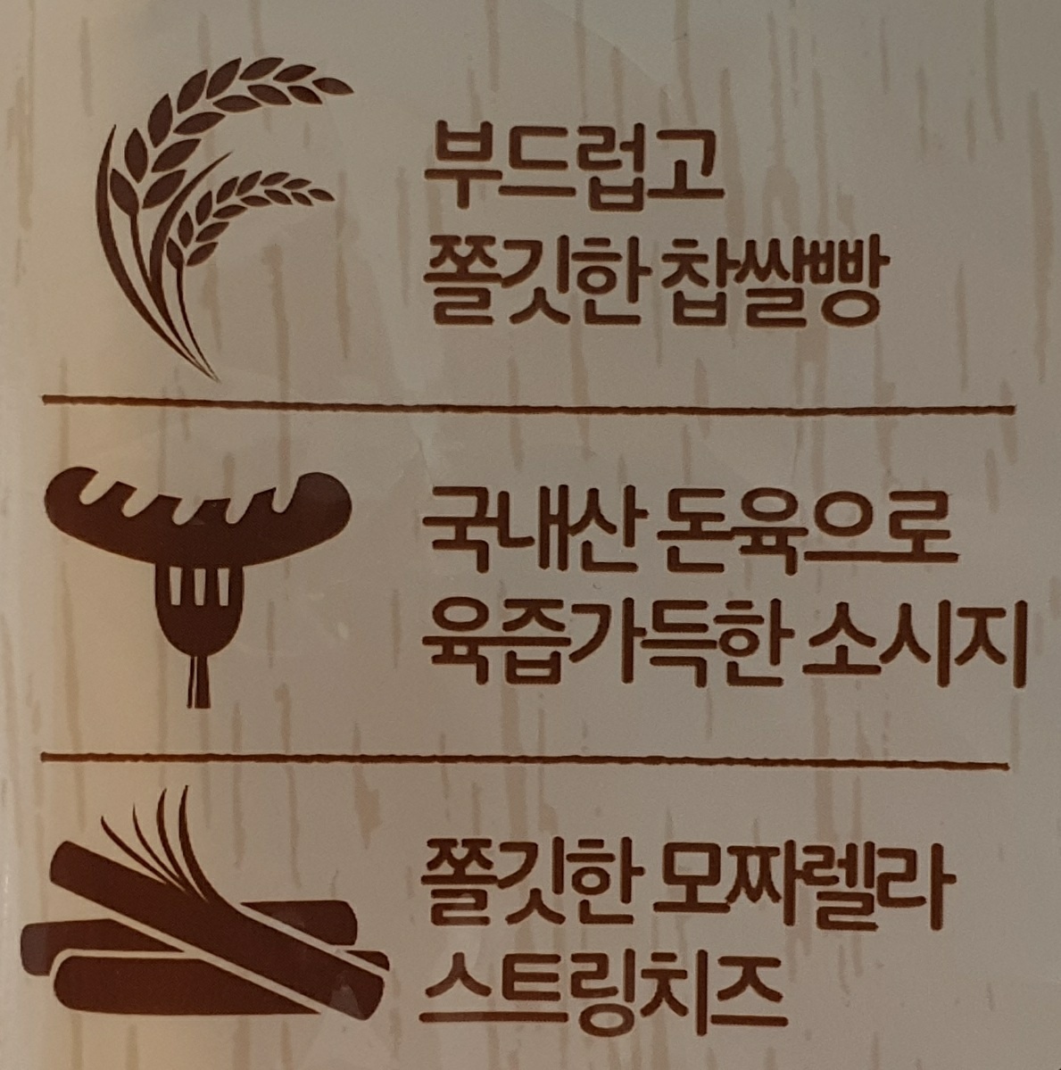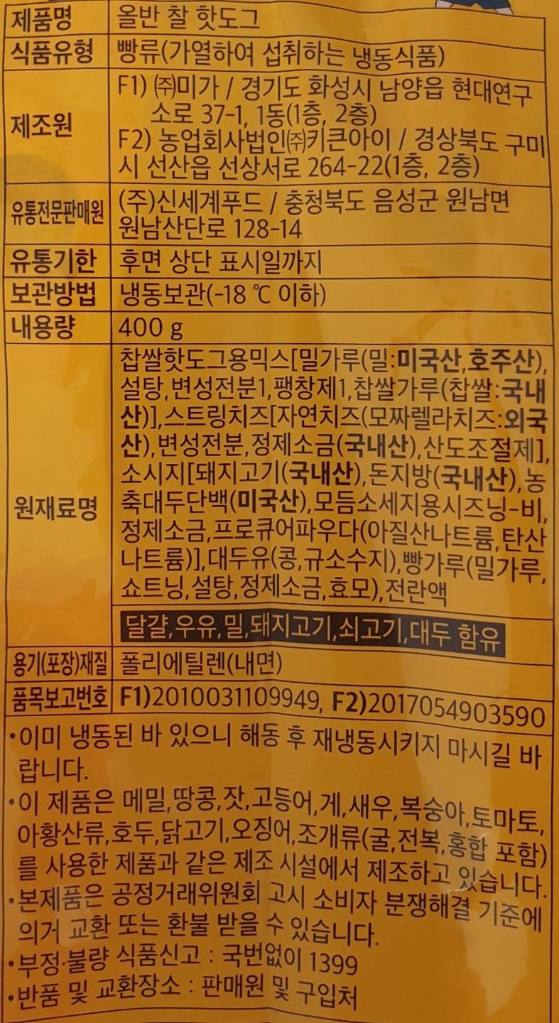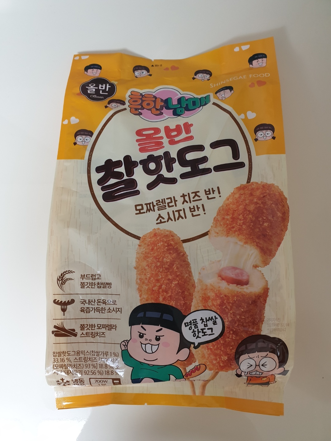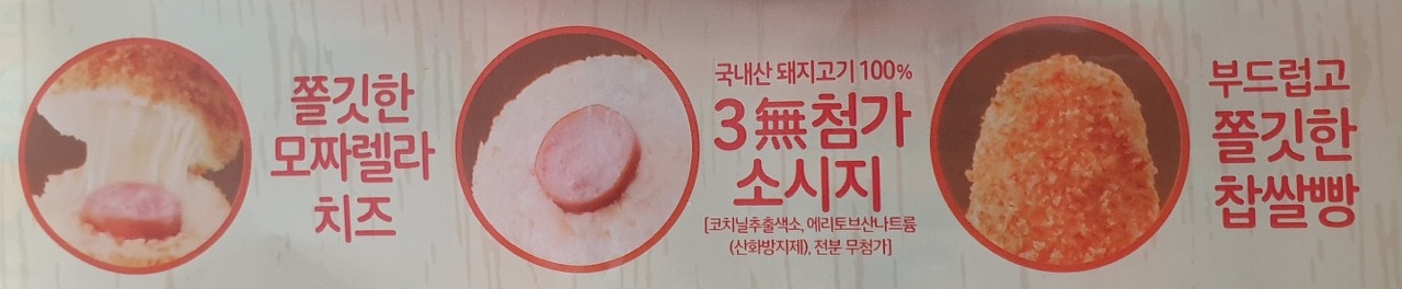 찹쌀핫도그용믹스(찹쌀가루 1%)33.16%, 스트링치즈 [자연치즈(모짜렐라치즈) 93%] 18.8%, 소시지(돼지고기 92.56%) 18.8%