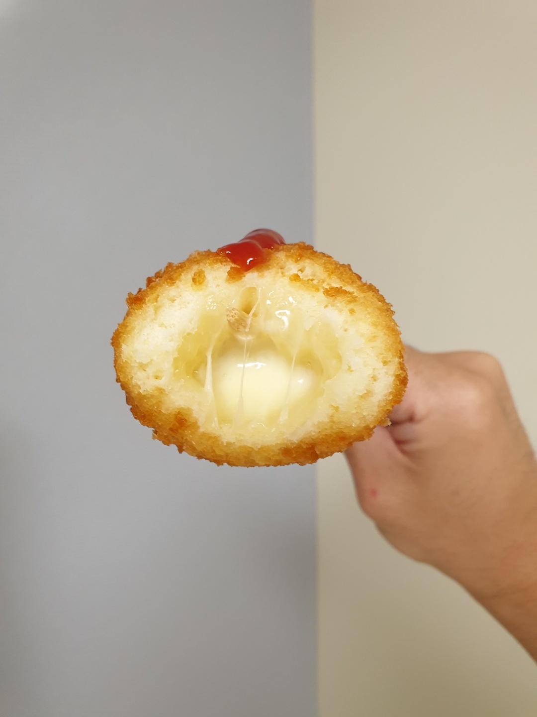 한 입 먹으니 치즈가 듬뿍 들어 있습니다.