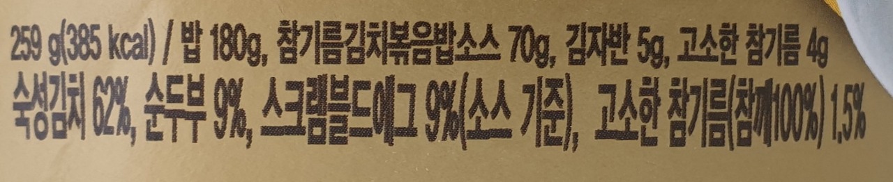 숙성김치 62%, 순두부 9%, 스크램블드에그 9%(소스 기준), 고소한 참기름 (참깨 100%) 1.5%