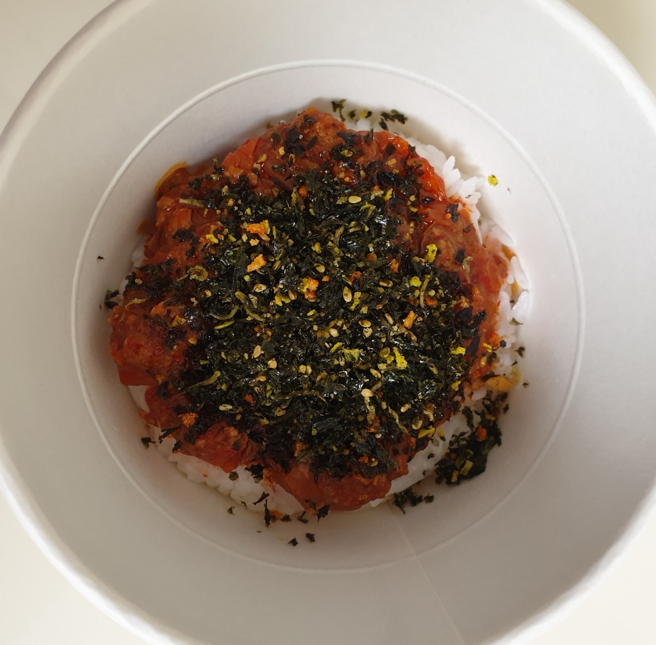 2. 컵 용기에 데운 오뚜기밥과 소스, 김자반, 참기름을 넣고 골고루 잘 비벼서 맛있게 드세요.