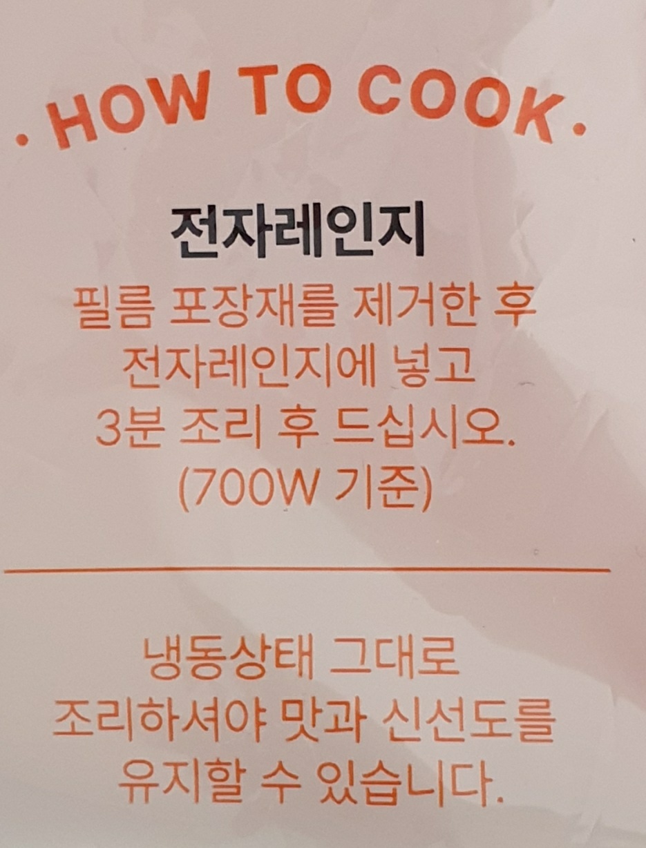 필름 포장재를 제거한 후 전자레인지에 넣고 3분 조리 후 드십시오.(700W 기준)