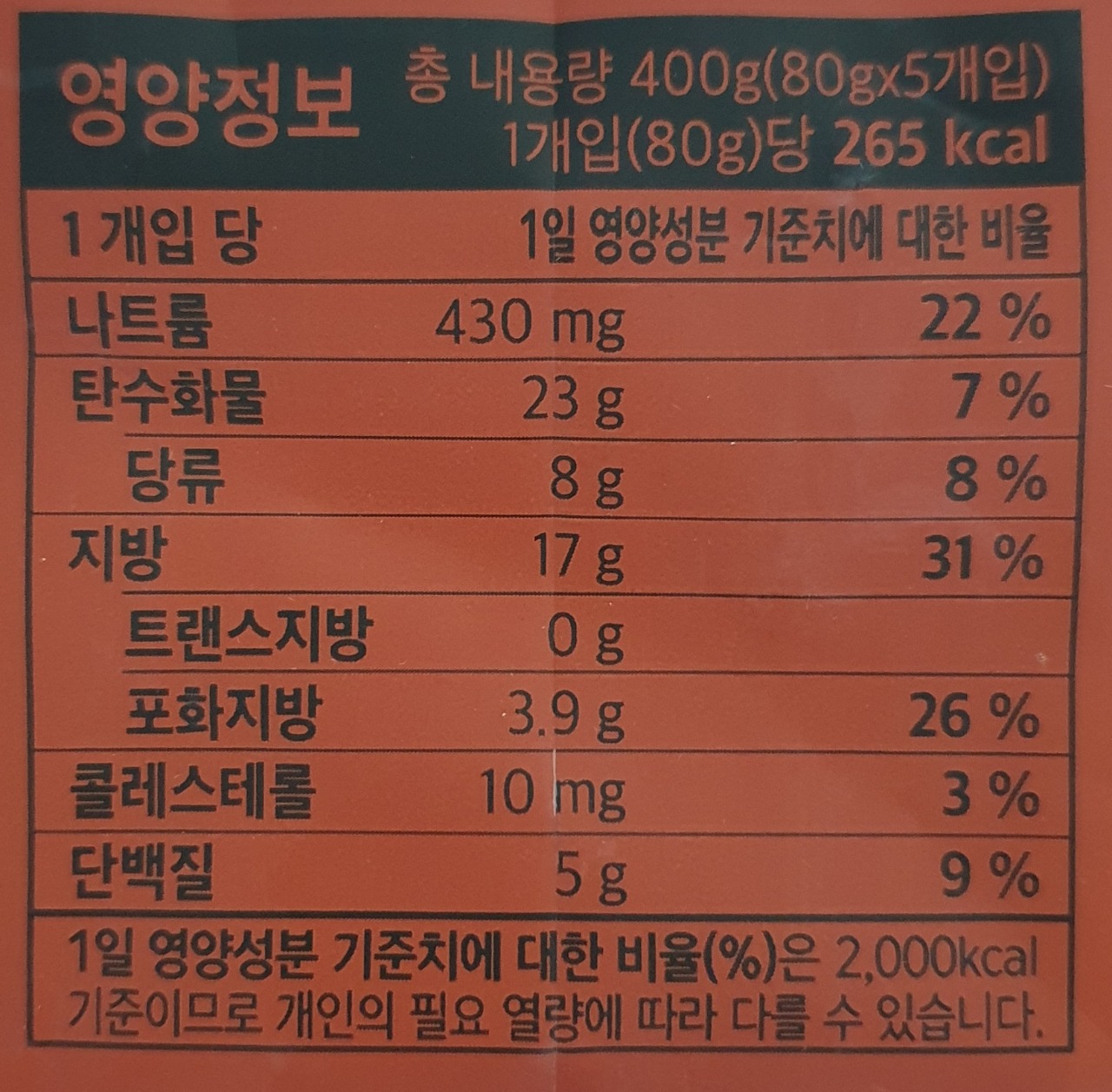 5개입 / 400g(1,325kcal) / -18℃이하 냉동보관 / 700W 1분