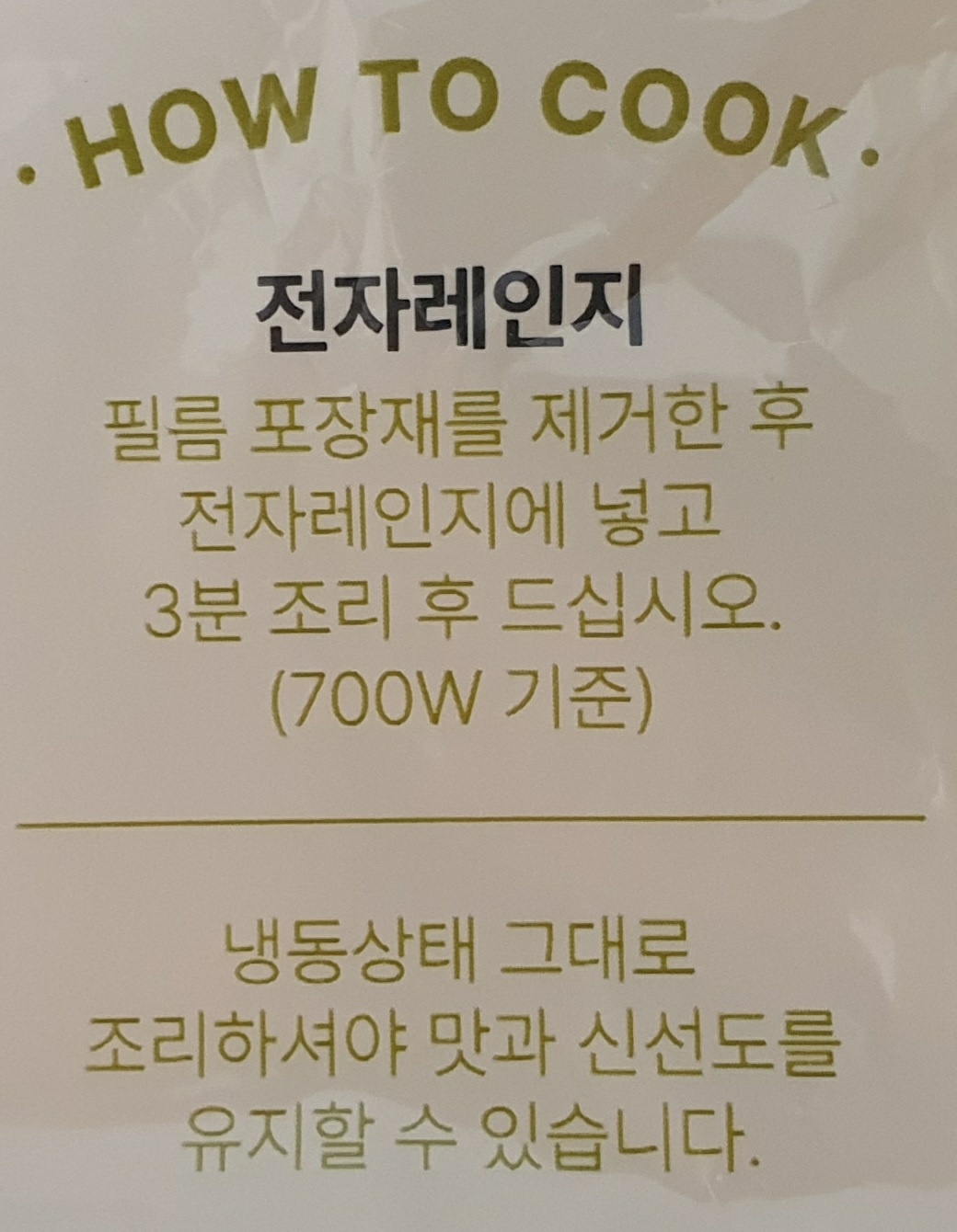 필름 포장재를 제거한 후 전자레인지에 넣고 3분 조리 후 드십시오.(700W 기준)