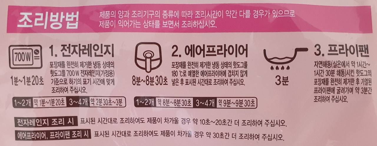 포장재를 완전히 제거한 냉동 상태의 핫도그를 700W 전자레인지(가정용) 기준으로 하기의 표기 시간에 맞게 조리하여 주십시오.