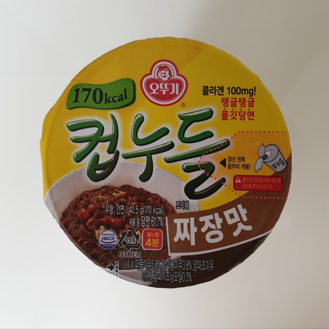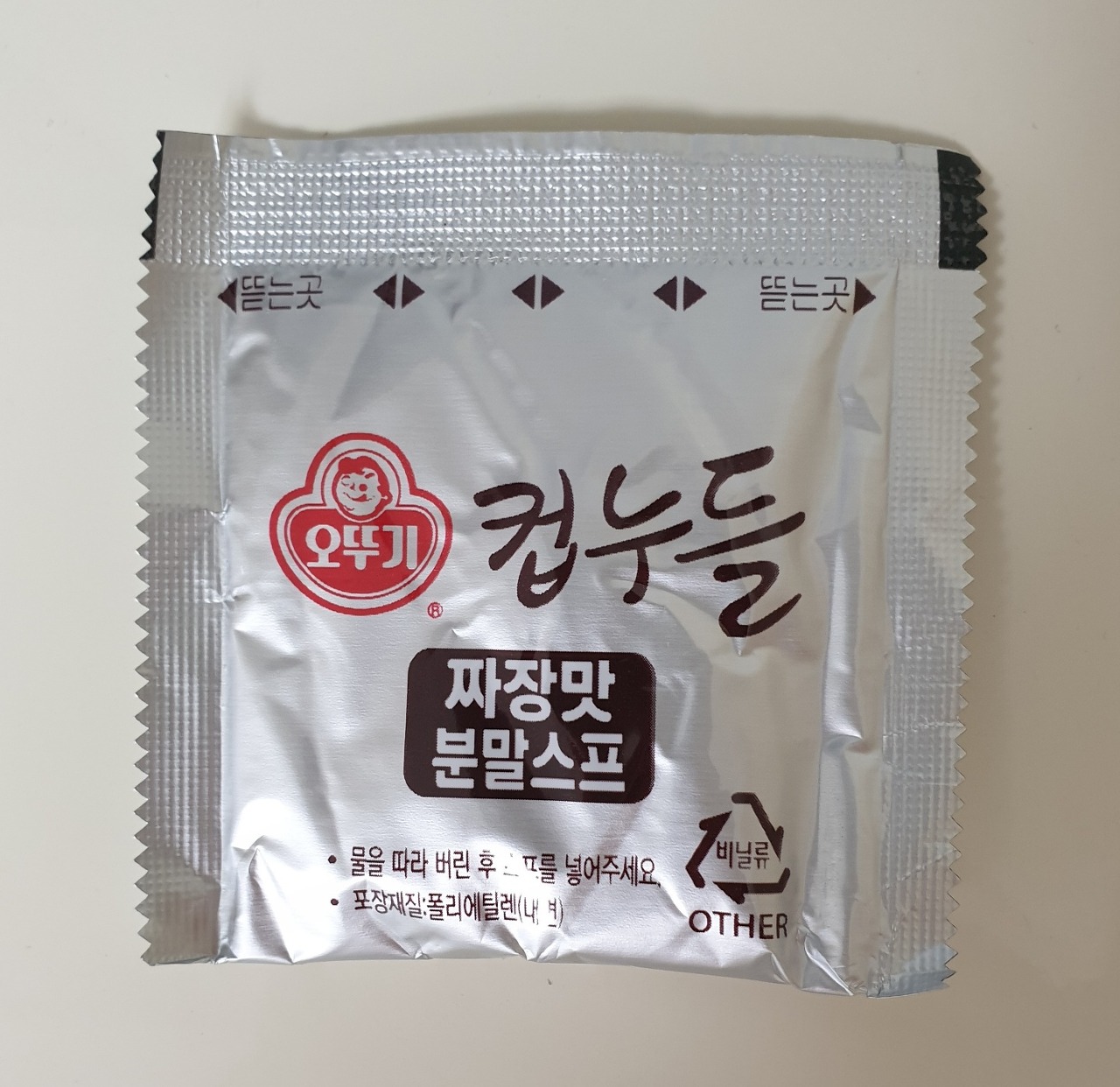 1. 뚜껑을 개봉한 후 건더기 스프를 넣고 끓는 물(200ml)을 표시선까지 부은 다음