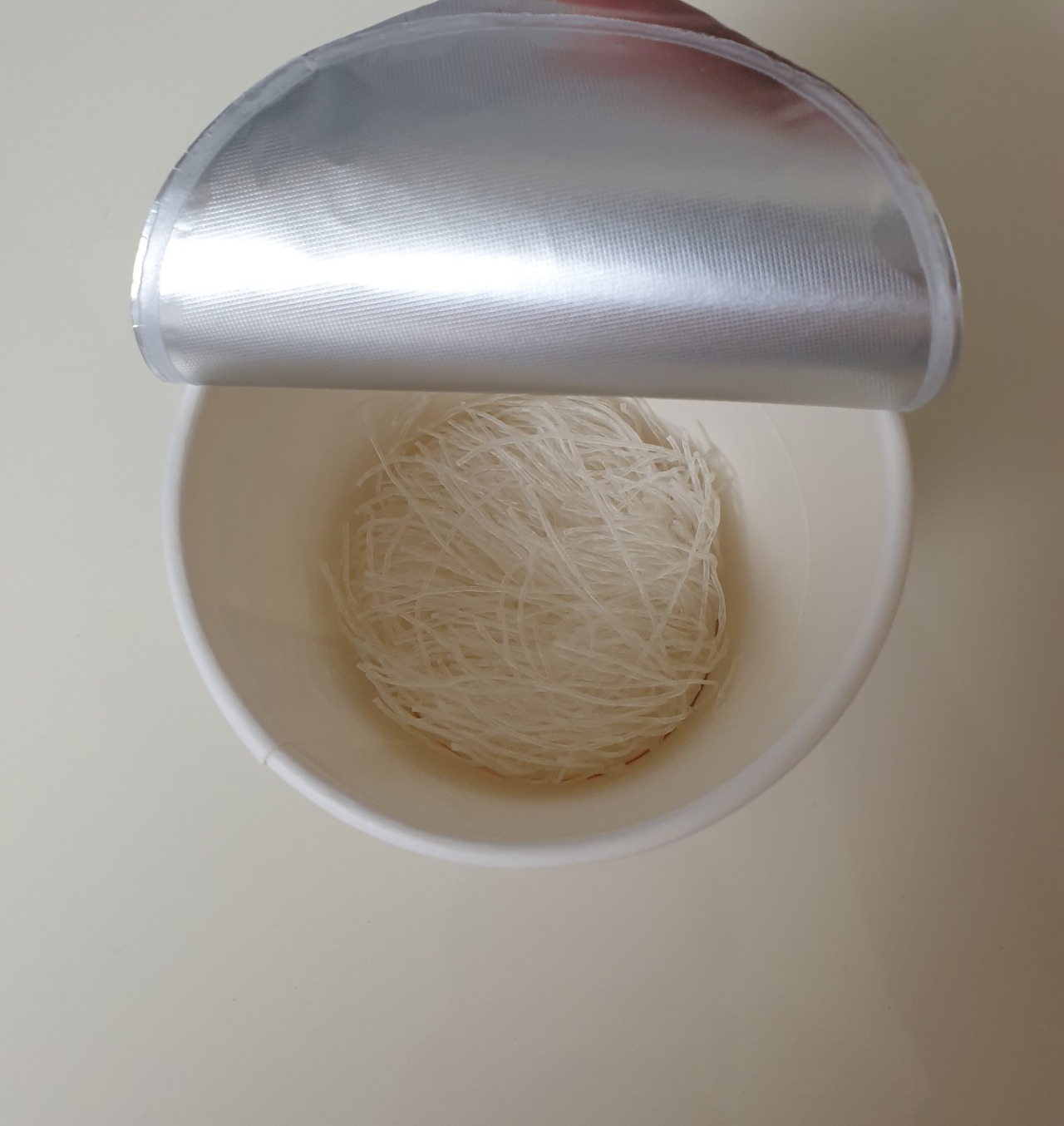 2. 4분 후 뚜껑에 표시된 점선 왼쪽 끝부분을 잡고 뜯어내어 물을 버린 후