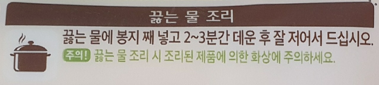 2. 끓는 물 조리: 끓는 물에 봉지 째 넣고 2~3분간 데운 후 잘 저어서 드십시오.