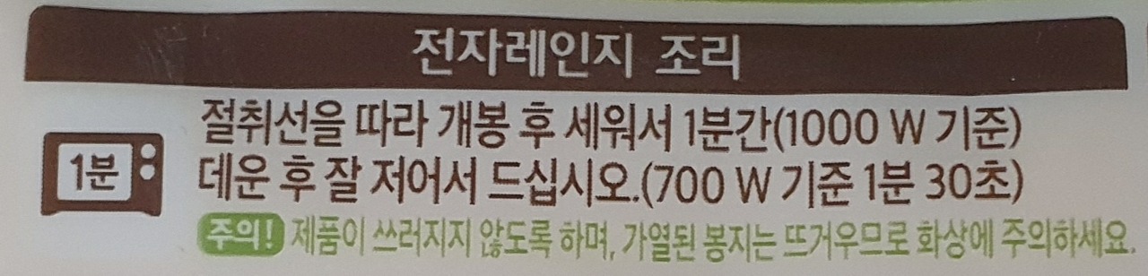 1. 전자레인지 조리: 절취선을 따라 개봉 후 세워서 1분간(1,000W) 기준) 데운 후 잘 저어서 드십시오.(700W 기준 1분 30초)