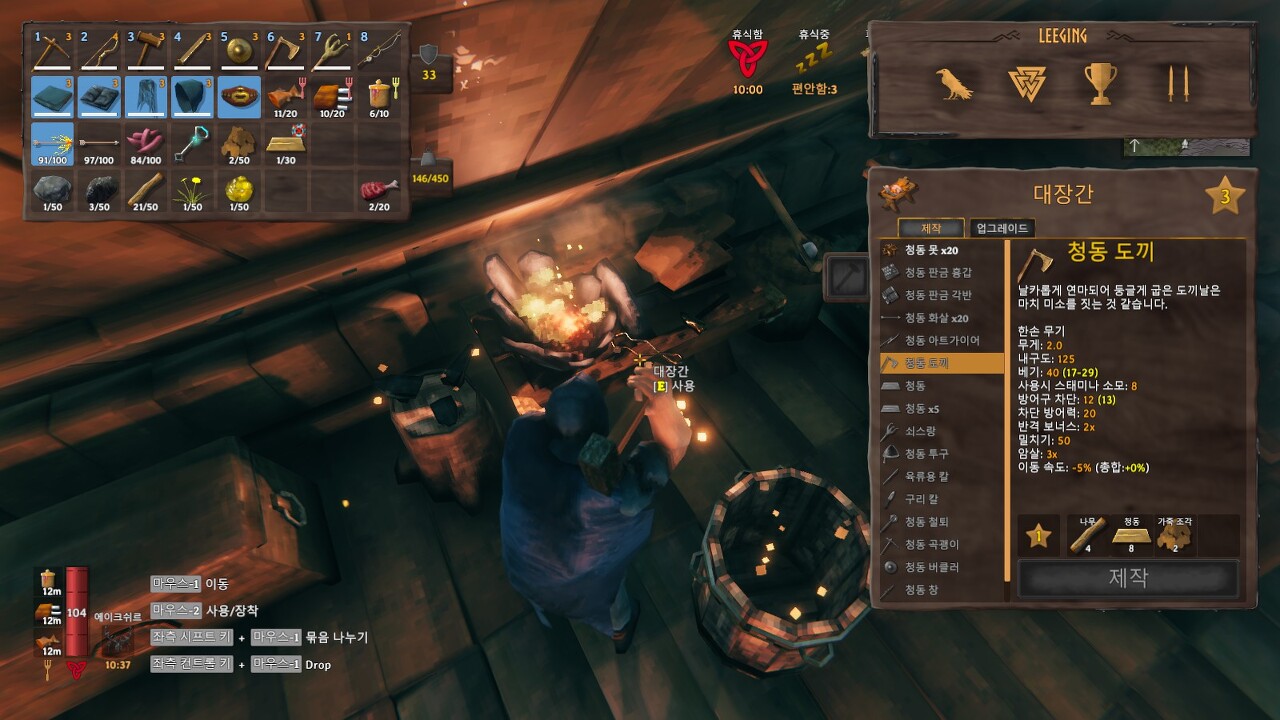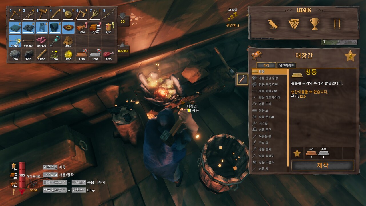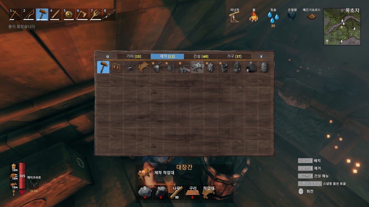 대장간 재료: 돌 4개, 석탄 4개, 나무 10개, 구리 6개