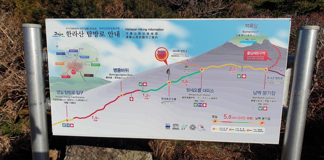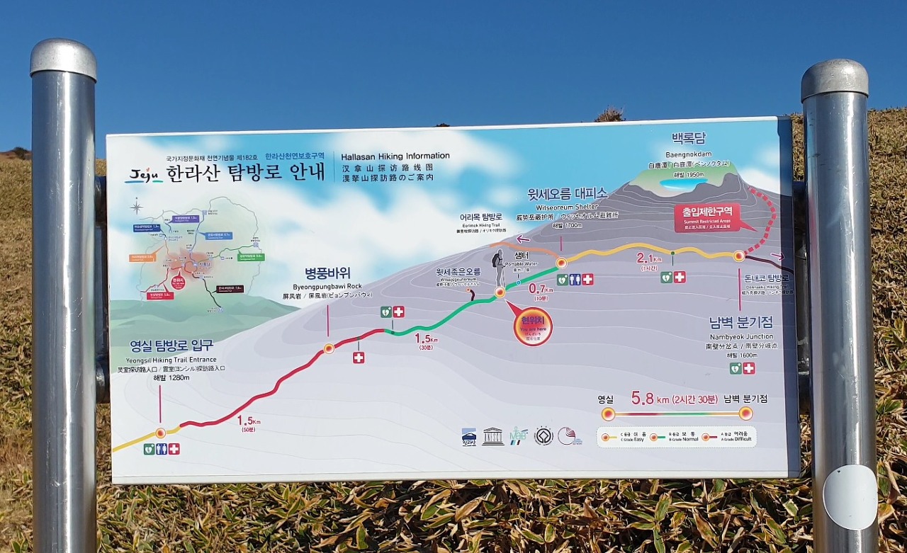 - 남벽 분기점은 윗세오름과 연결되어 있어서 어리목 탐방로나 돈내코 탐방로를 통해 하산 가능합니다.