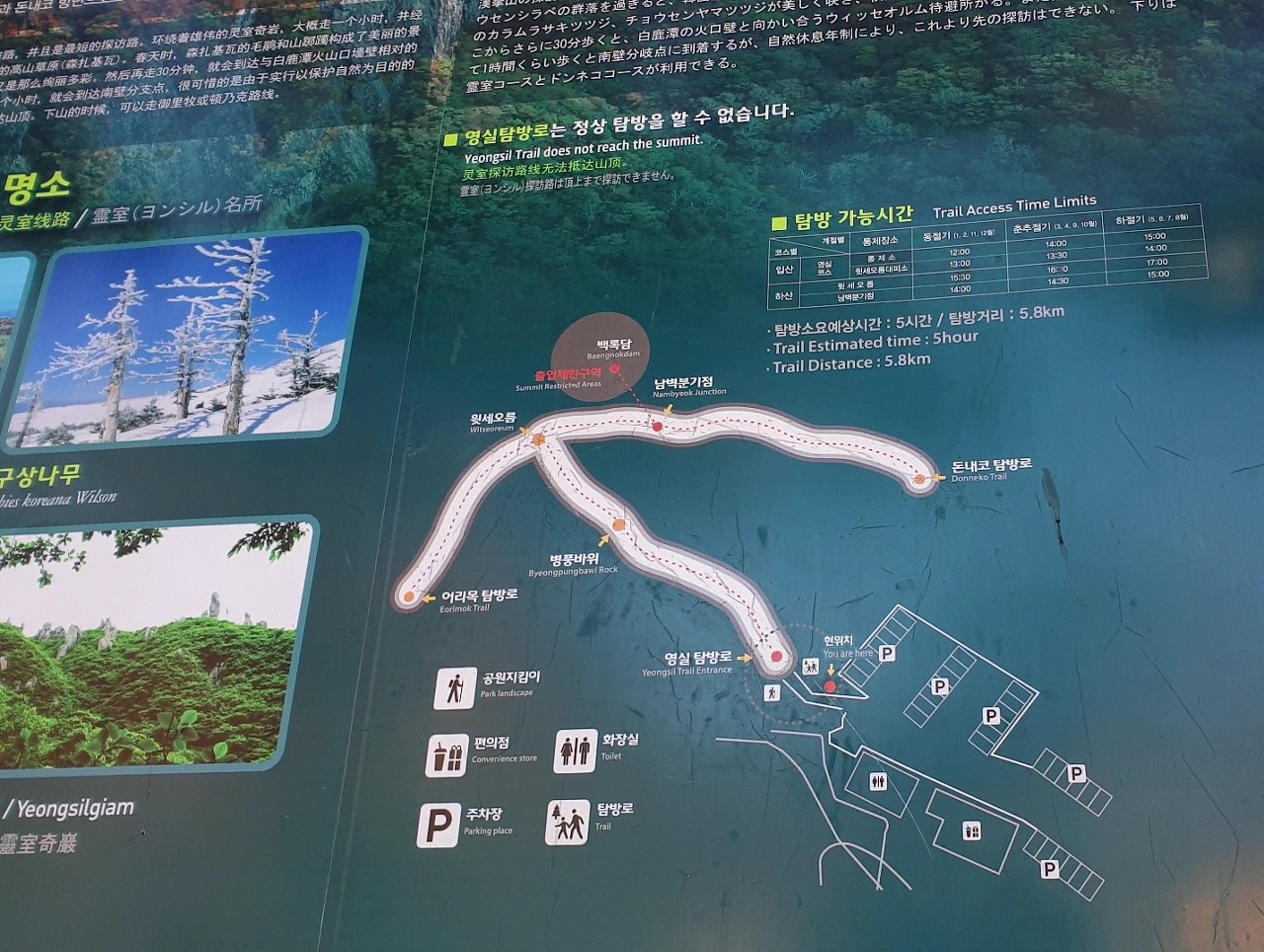 - 영실 매표소에도 주차장이 있지만, 여기에 주차하면 2.5km를 걸어 올라가야 하기 때문에 되도록 영실 입구 주차장에 주차하는 것이 좋습니다.