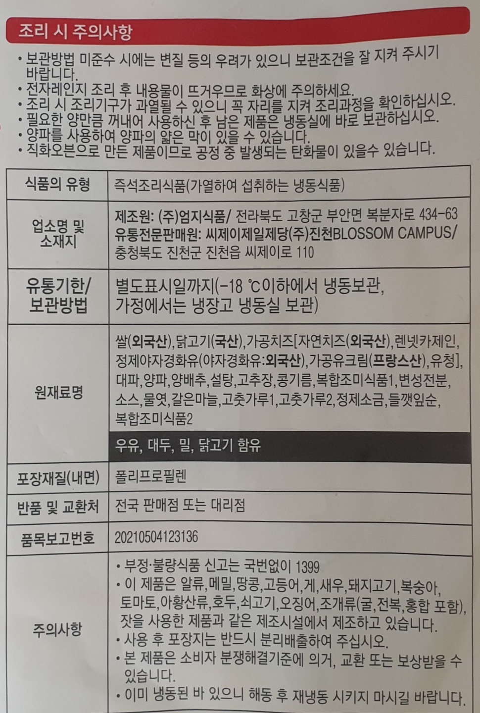 쌀 38.1%, 가공치즈 8.9%(자연치즈 70%), 닭고기 9.6%