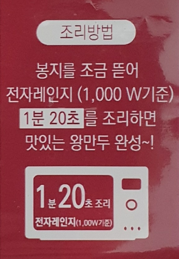 봉지를 조금 뜯어 전자레인지 (1,000W 기준) 1분 20초를 조리하면 맛있는 왕만두 완성!