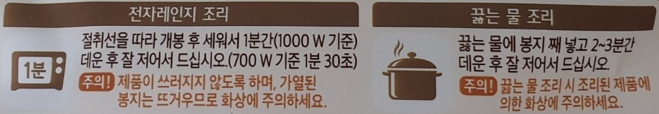 절취선을 따라 개봉 후 1분간(1,000W 기준) 데운 후 잘 저어서 드십시오.(700W 기준 1분 30초)