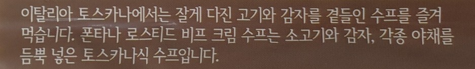폰타나 로스티드 비프 크림 수프는 소고기와 감자, 각종 야채를 듬뿍 넣은 토스카나식 수프 입니다.