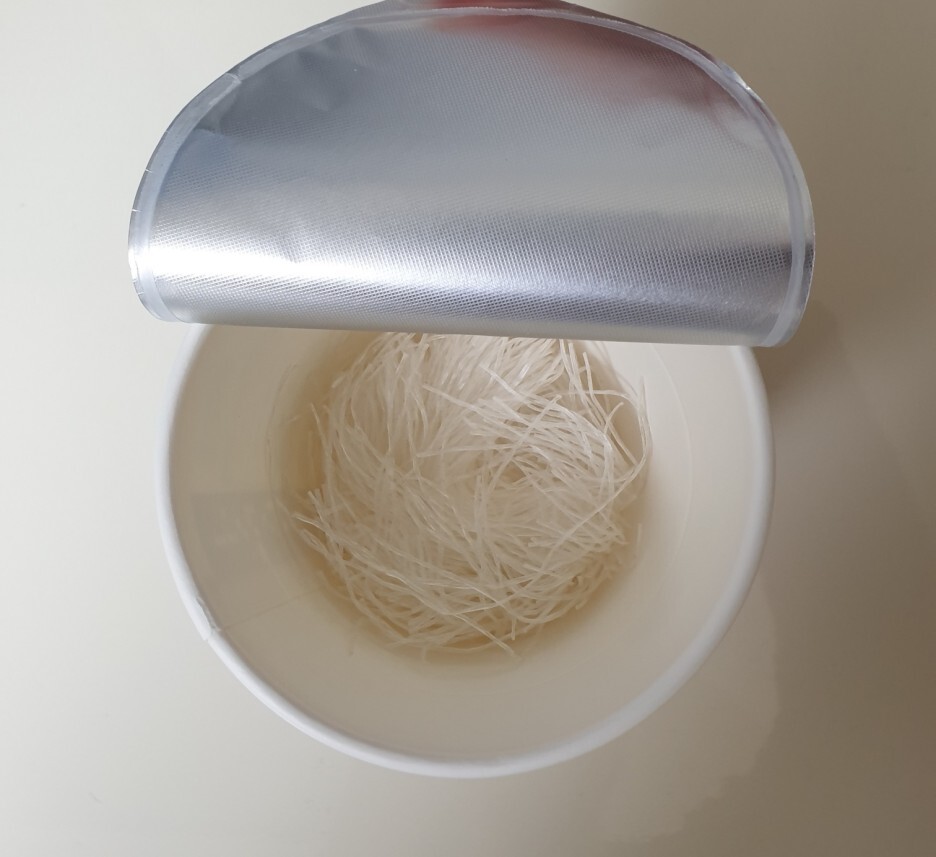 - 뚜껑을 개봉한 후 끓는물(200ml)을 표시선까지 부은 다음