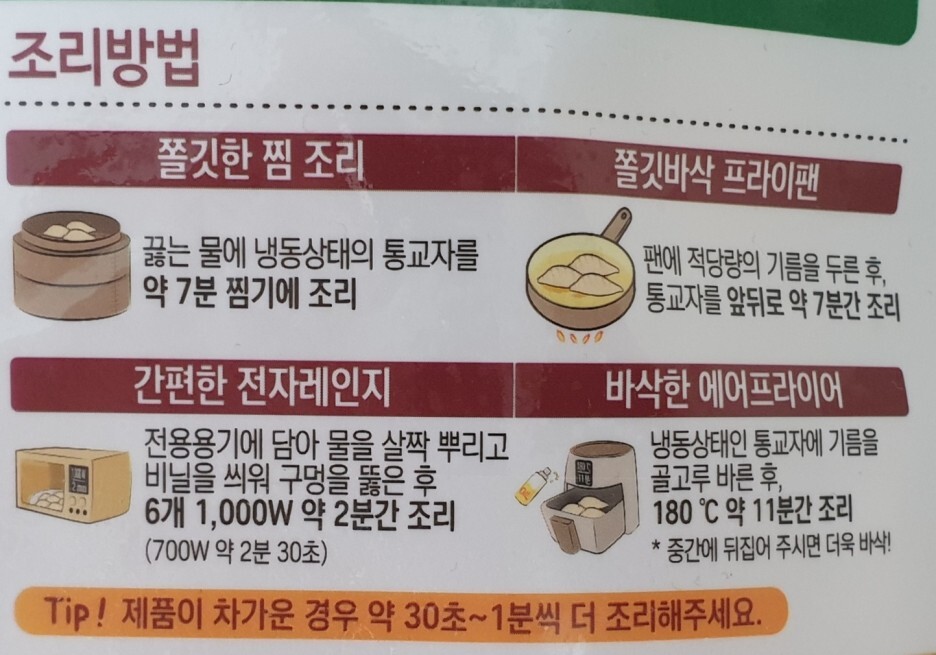 - 쫄깃한 찜 조리: 끓는 물에 냉동 상태의 통교자를 약 7분 찜기에 조리