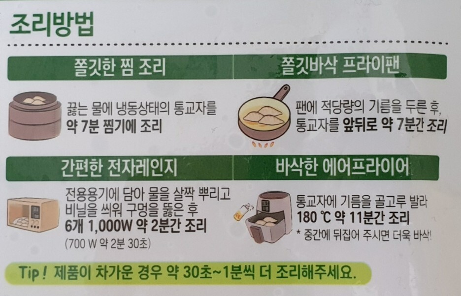 - 쫄깃 바삭 프라이팬: 팬에 적당량의 기름을 두른 후, 통교자를 앞뒤로 약 7분간 조리