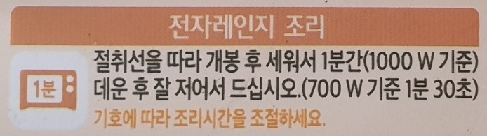 절취선을 따라 개봉 후 세워서 1분간(1000W 기준) 데운 후 잘 저어서 드십시오(700W 기준 1분 30초)