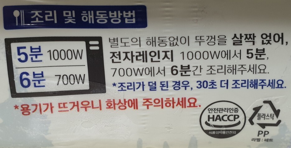 별도의 해동 없이 뚜껑을 살짝 얹어, 전자레인지 1000W에서 5분, 700W에서 6분간 조리해주세요.