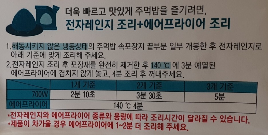 * 전자레인지와 에어프라이어 종류와 용량에 따라 조리시간이 달라질 수 있습니다.