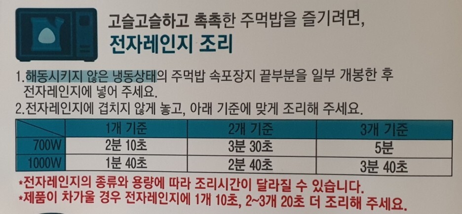 - 해동시키지 않은 냉동 상태의 주먹밥 속포장지 끝부분 일부 개봉한 후 전자레인지로 아래 기준에 맞게 조리해주세요.