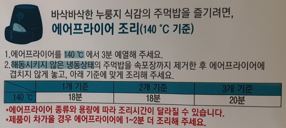 * 제품이 차가울 경우 에어프라이어에 1~2분 더 조리해주세요.