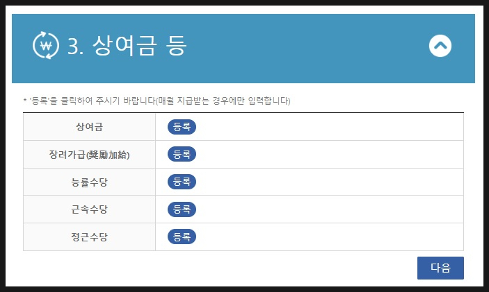 본인이 상여금, 수당을 받고 있다면 등록해서 입력한 뒤 다음을 클릭합니다.