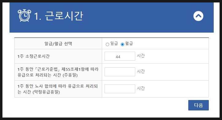 일급/월급을 선택하고 소정근로시간을 입력한 뒤 다음을 클릭합니다.