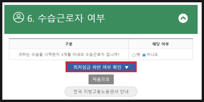 마지막으로 수습근로자 여부를 선택한 뒤 [최저임금 위반 여부 확인]을 클릭합니다.