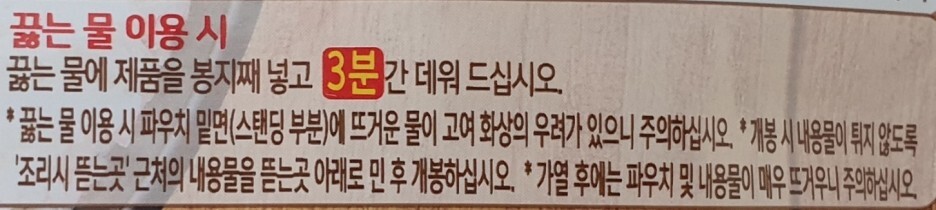 - 끓는 물 이용 시: 끓는 물에 제품을 봉지째 넣고 3분간 데워 드십시오.