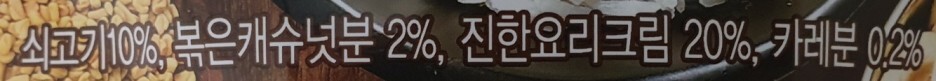 쇠고기 10%, 볶음캐슈넛분 2%, 진한요리크림 20%, 카레분 0.2%