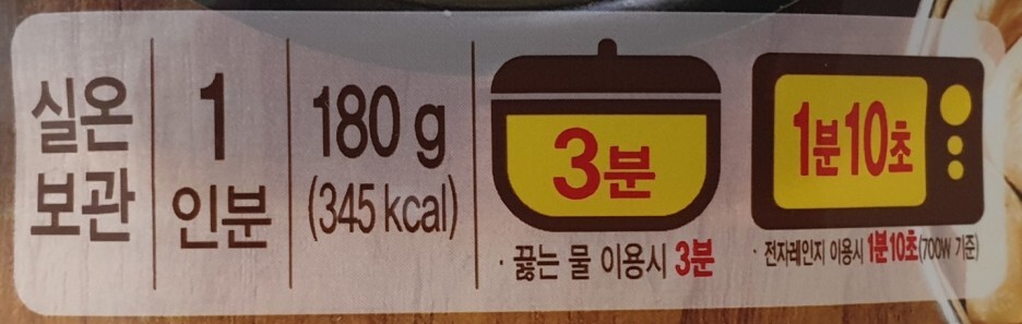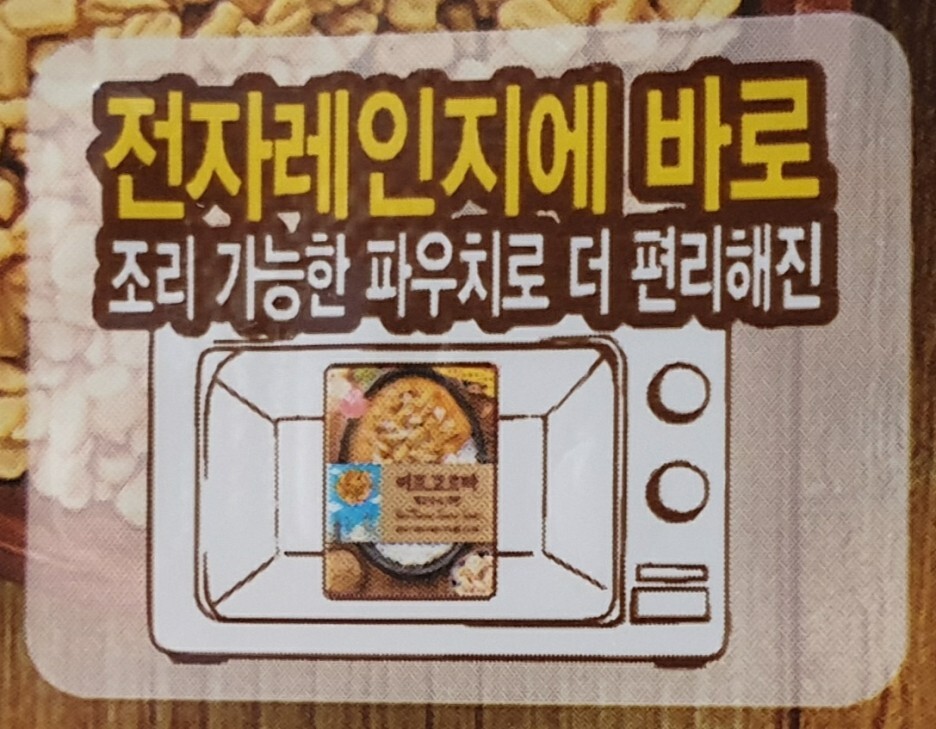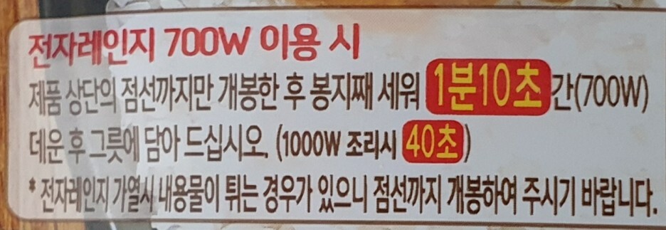 - 전자레인지 이용 시: 제품 상단의 점선까지만 개봉한 후 봉지째 세워 1분 10초(700W)간 데운 후 그릇에 담아 드십시오. (1000W 조리 시 40초)
