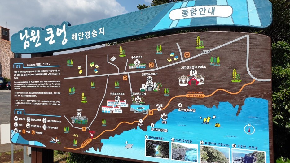 2. 남원큰엉해안: 서귀포 특유의 해안 절벽을 따라 걷기 좋은 장소. 한반도 포토존이 있는 곳