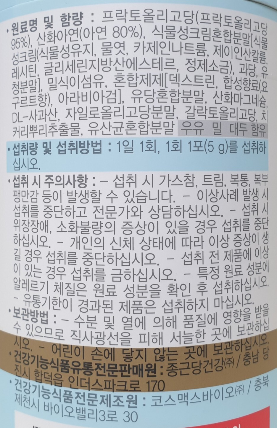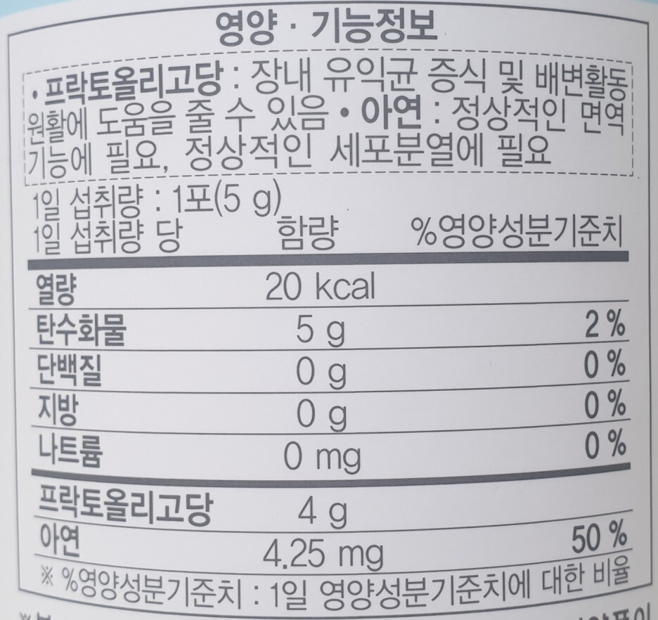 - 프락토올리고당 : 장내 유익균 증식 및 배변활동 원활에 도움을 줄 수 있음