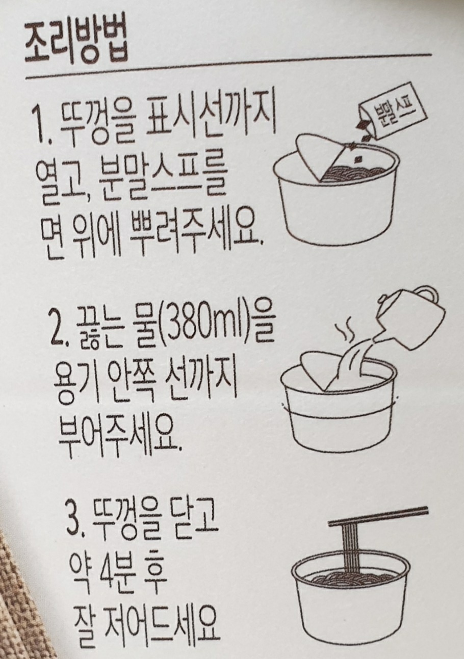- 끓는 물(380ml)을 용기 안쪽 선까지 부어주세요.