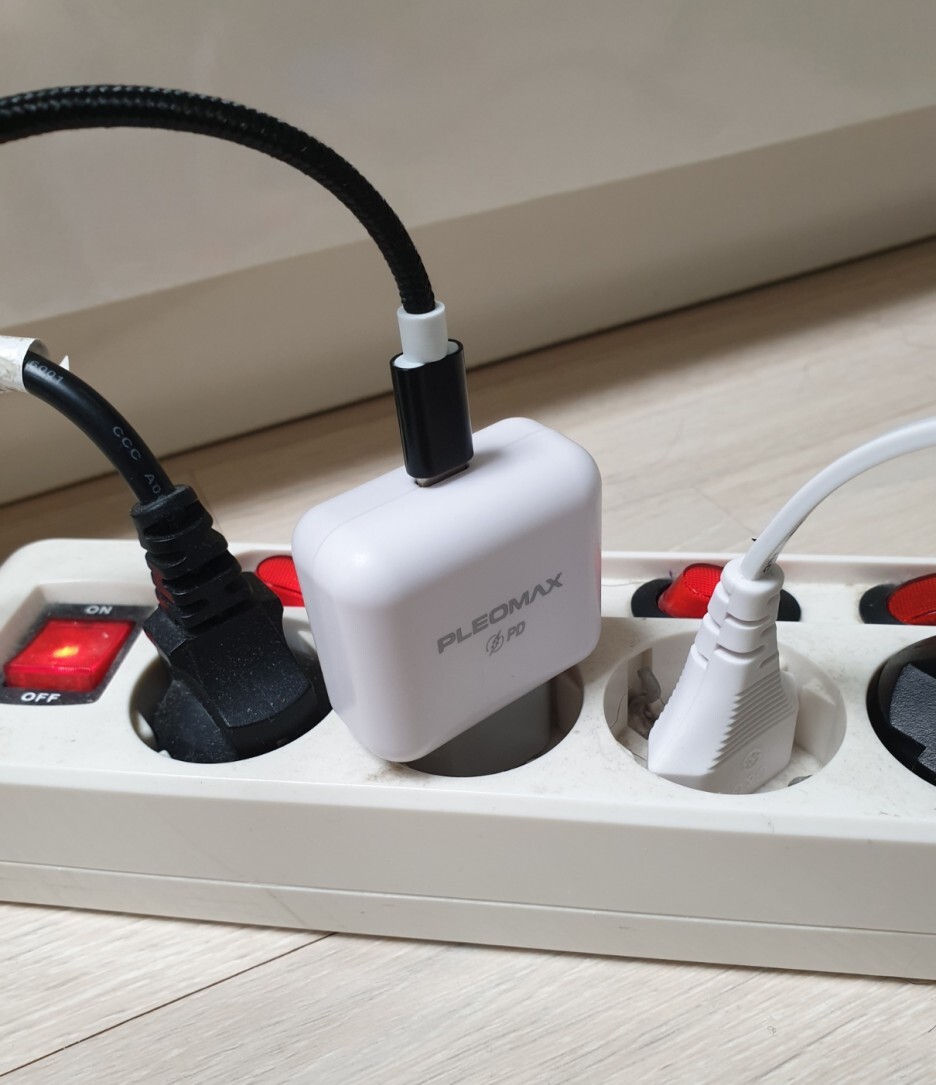실제 멀티탭에 충전기를 장착한 모습입니다.