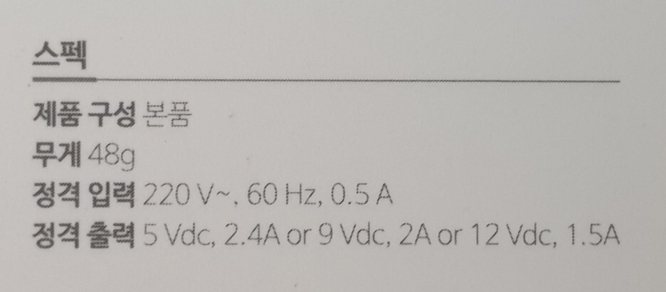 - 정격 출력 : 5Vdc, 2.4A or 9Vdc, 2A or 12Vdc, 1.5A
