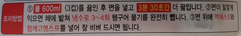 - 물 600ml (3컵)를 끓인 후 면을 넣고 3분 30초간 더 끓입니다.
