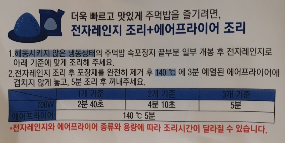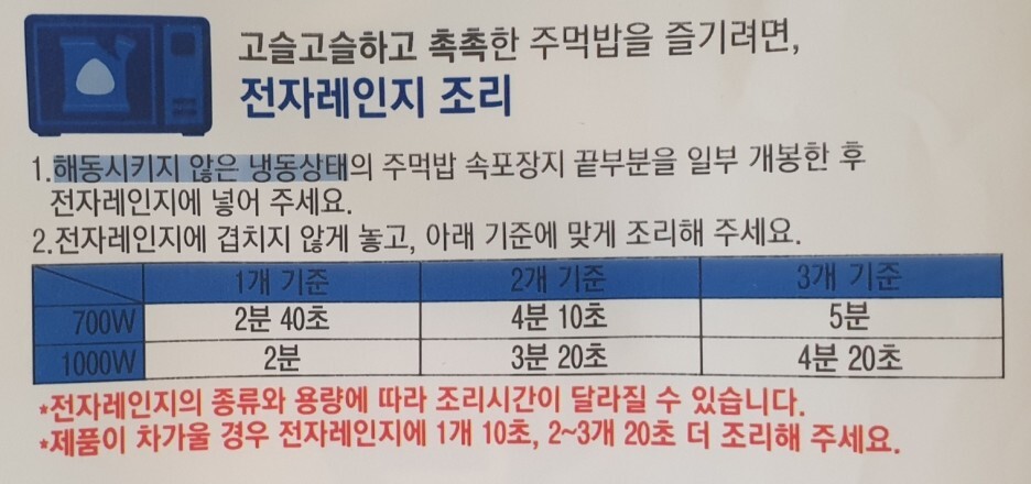 - 해동시키지 않은 냉동상태의 주먹밥 속포장지 끝부분 일부 개봉 후 전자레인지로 아래 기준에 맞게 조리해주세요.
