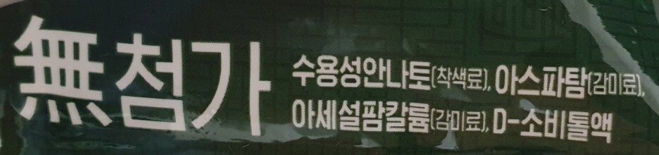 - 무첨가: 수용성안나토(착색료), 아스파탐(감미료), 아세설팜칼륨(감미료), D-소비톨액