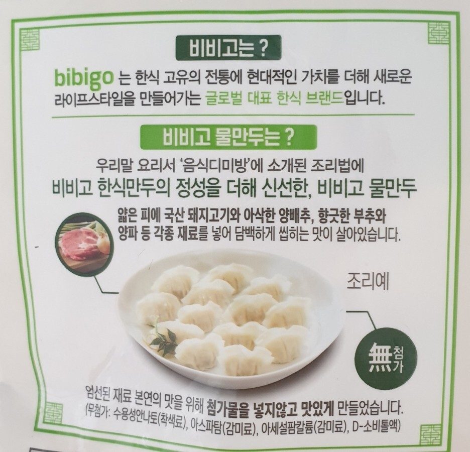 - 우리말 요리서 '음식디미방'에 소개된 조리법에 비비고 한식 만두의 정성을 더해 신선한, 비비고 물만두