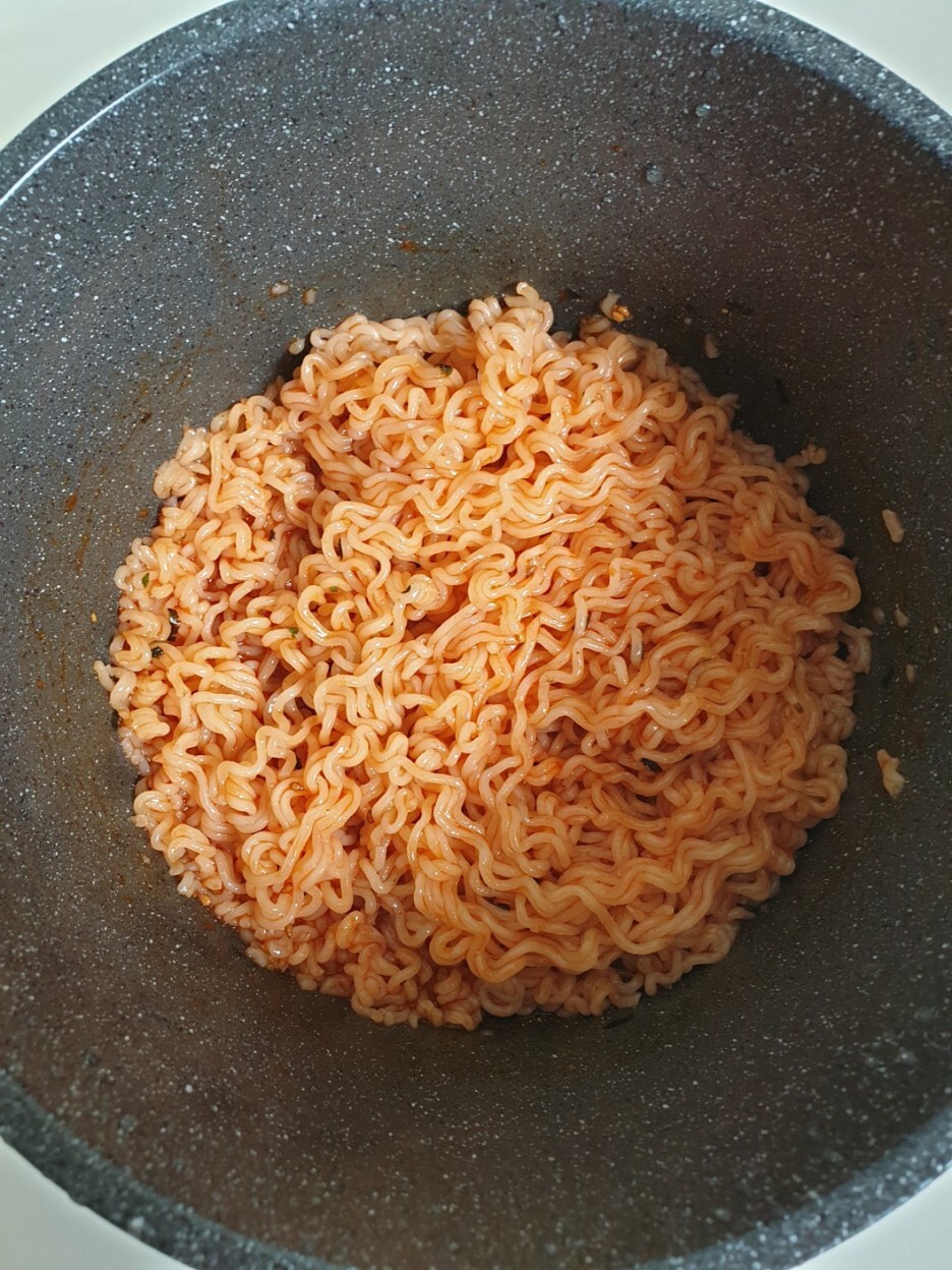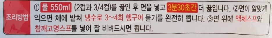 - 물 550ml (2컵과 3/4컵)를 끓인 후 면을 넣고 3분 30초간 더 끓입니다.