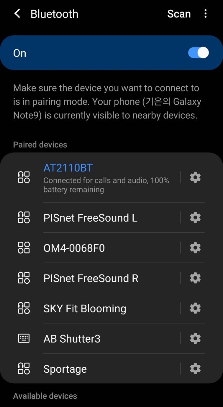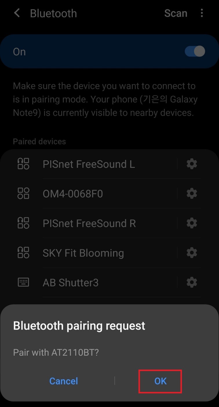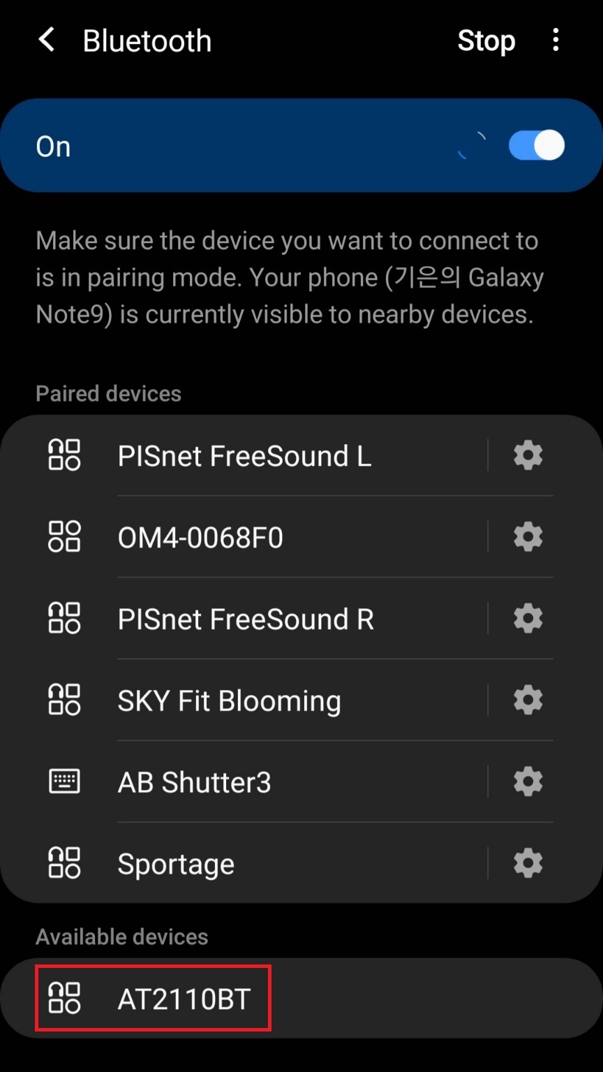 핸드폰 블루투스 화면에 가장 아래에 [AT2110BT]가 있습니다.