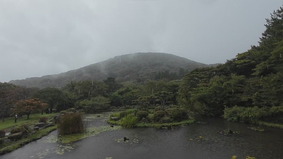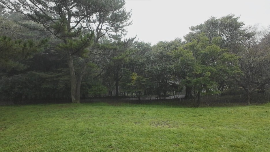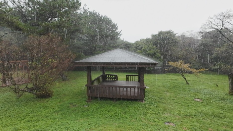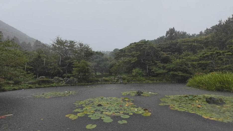 연못에 오니까 갑자기 비가 많이 내리기 시작합니다.