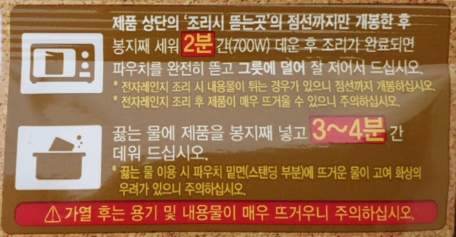 끓는 물에 제품을 봉지째 넣고 3~4분간 데워 드십시오.